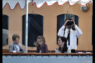 At 13:30 crown princess Mary and her two children arrived at Tolboden in Copenhagen harbour to join queen Margrethe II aboard the Dannebrog. From there, they watched a special military naval parade.